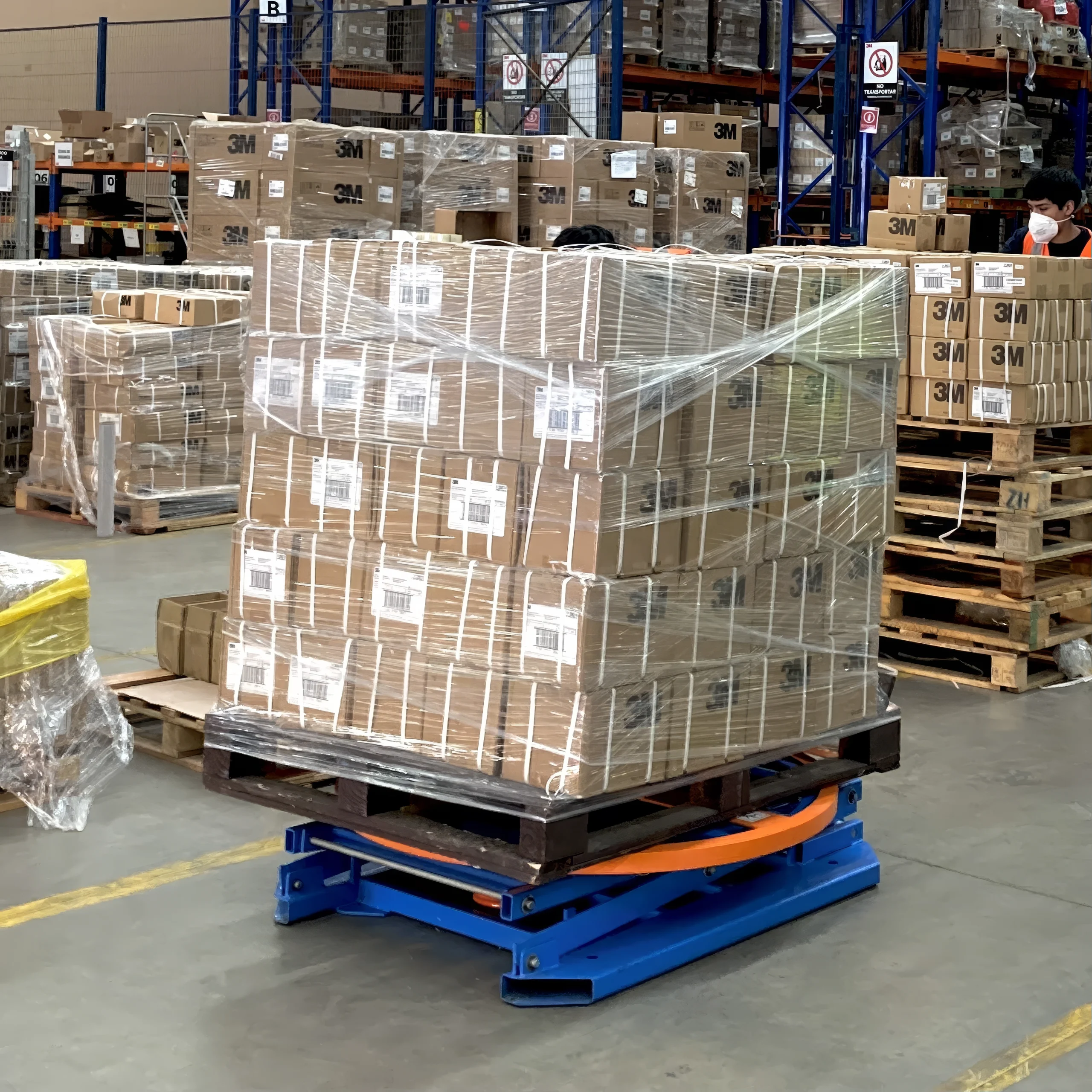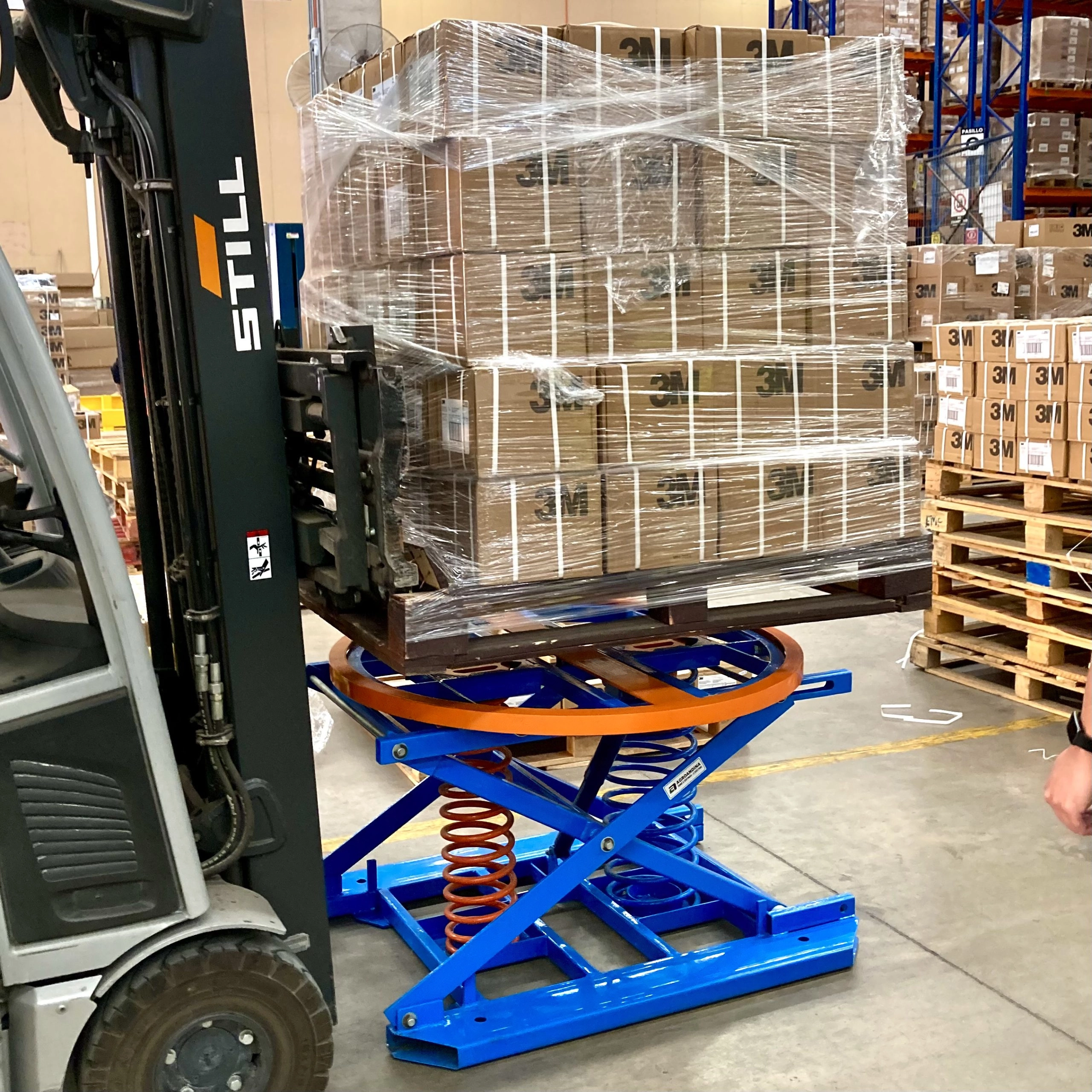 Equipo de apoyo para una carga y descarga de pallets en forma ergonómica y eficiente. Regulable para el uso con pallets de distintos pesos, manteniendo los bultos manipulados siempre a una altura y posición adecuada para quien realice el trabajo.